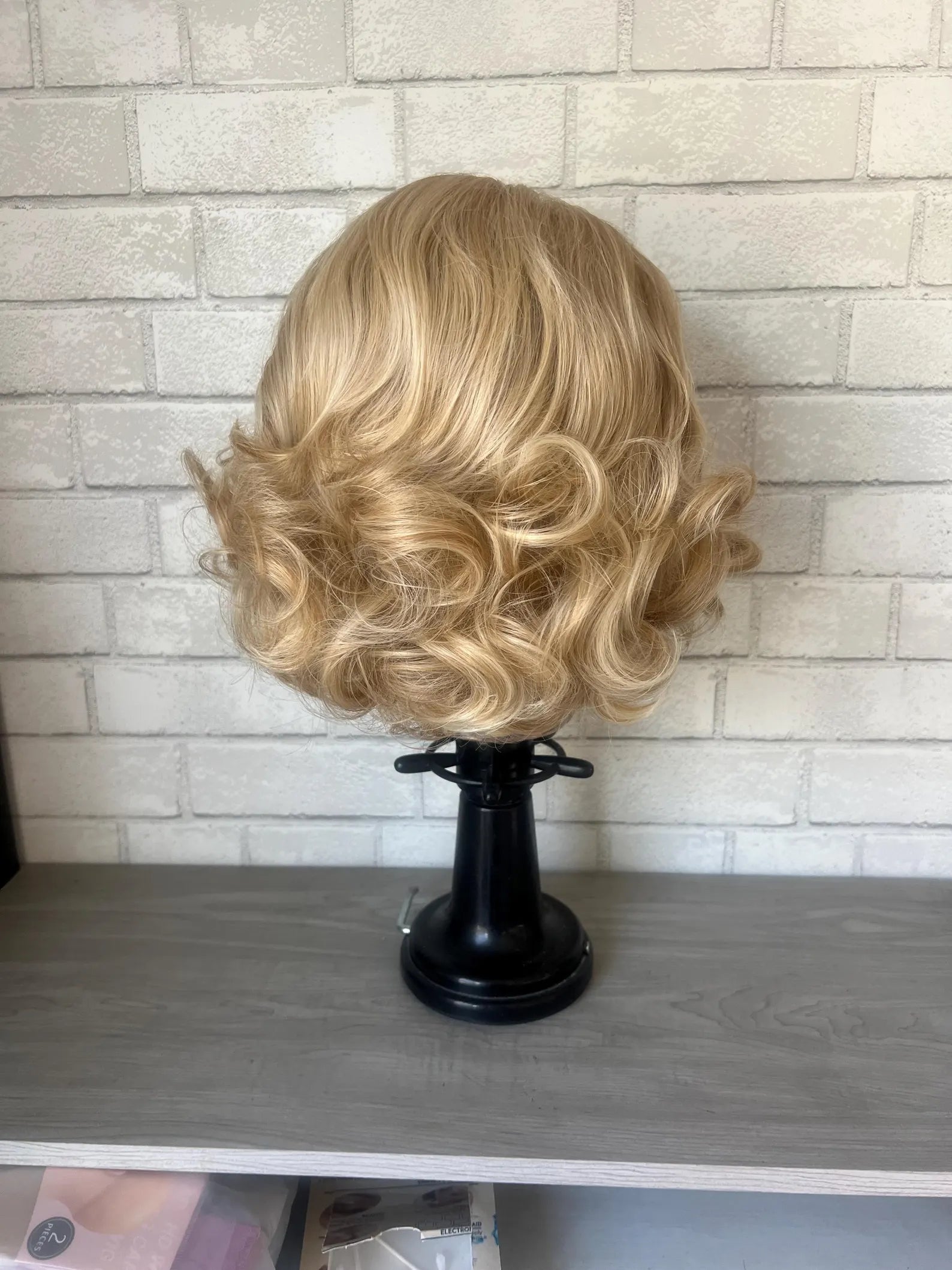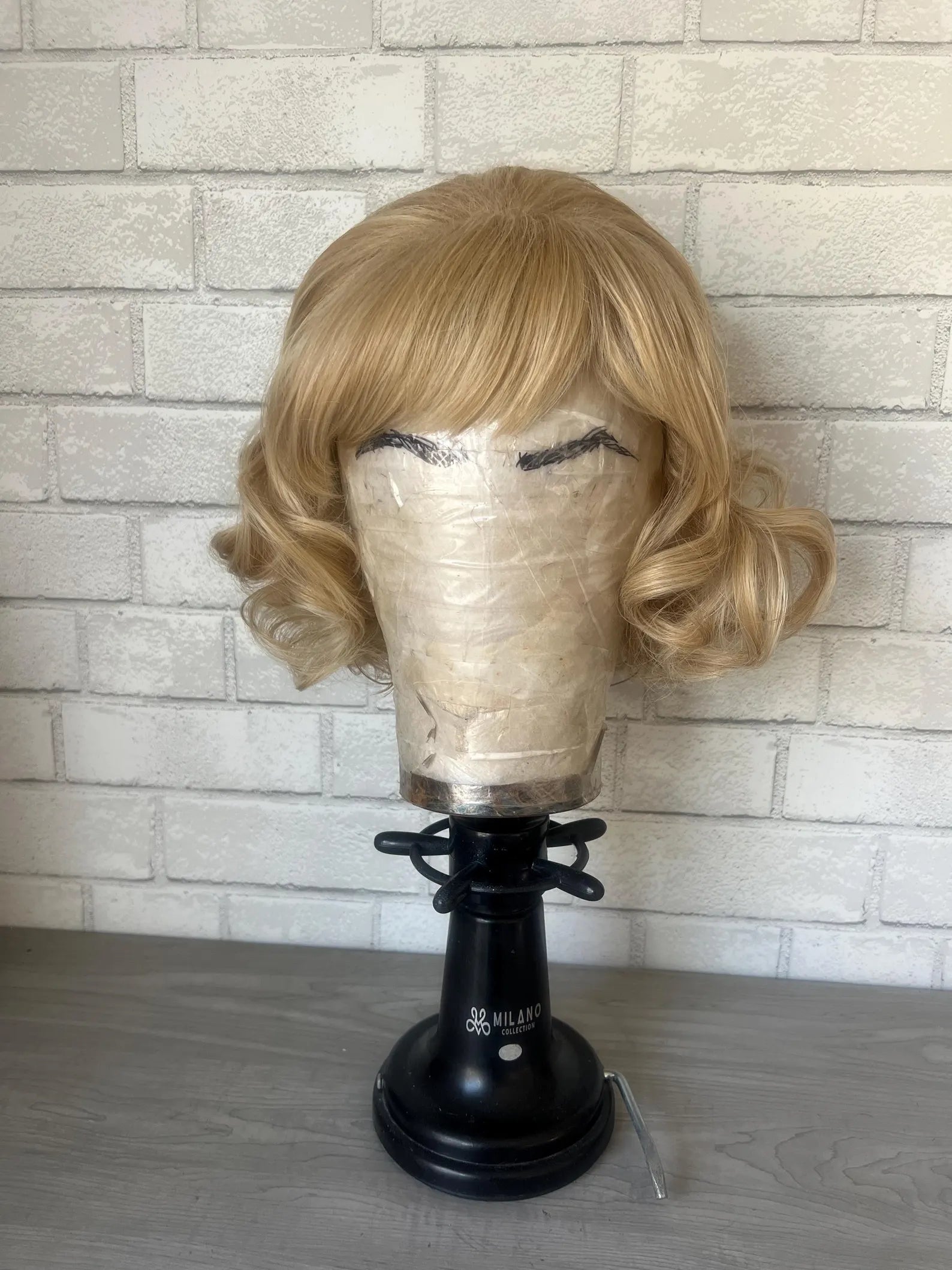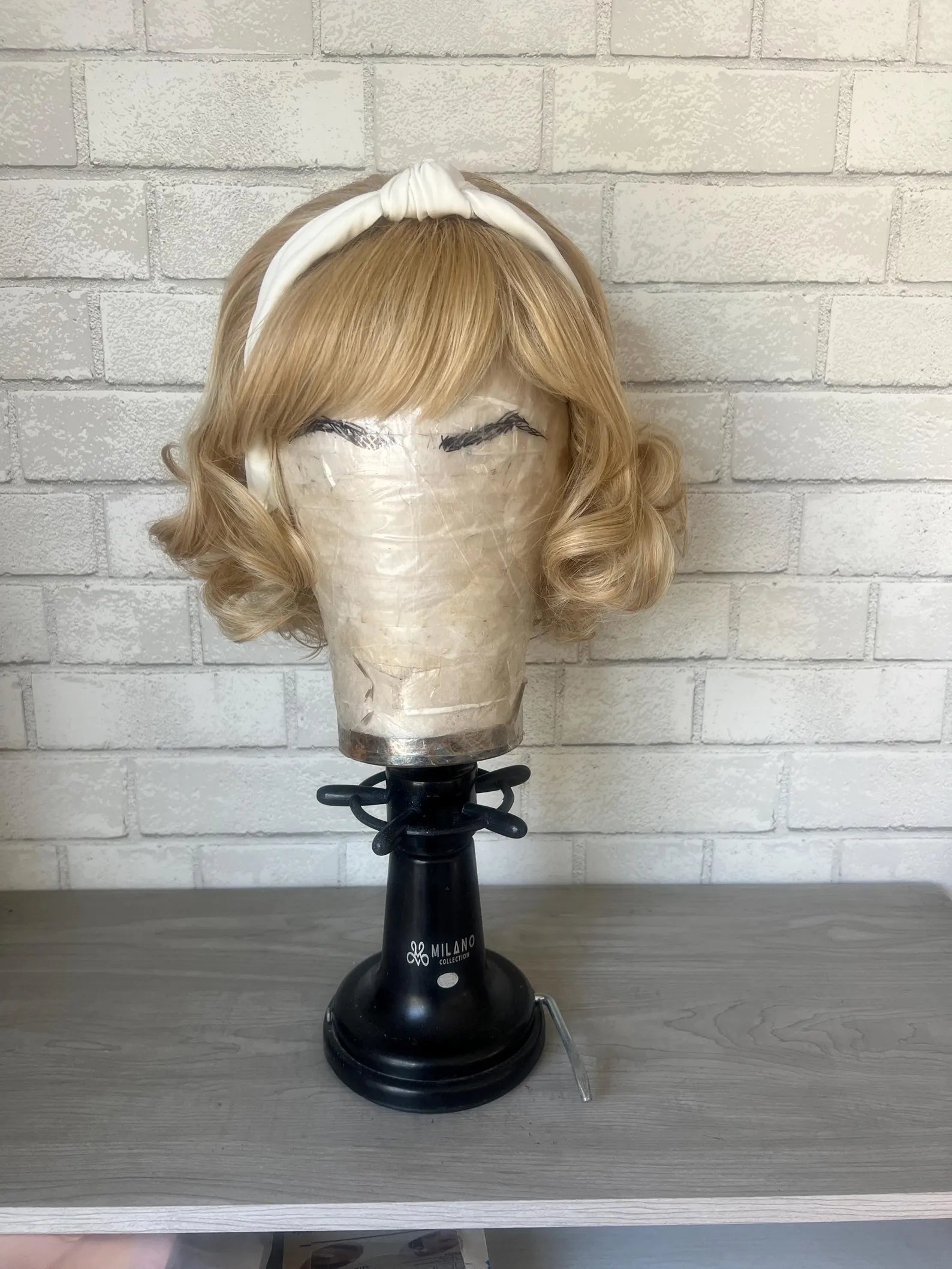 This wig holds a vintage style bob and is made of high-heat resistant synthetic fibers. Headband inclusion is optional and Wig is fitted on a 21 inch standard block.