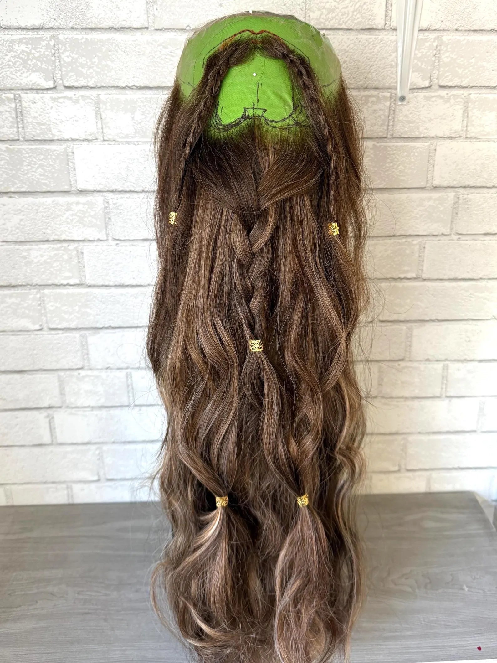 Beard and mustache set is 26" long and features heat resistant synthetic hair tied on 30 denier lace. Crafted with attention to detail, each each hair is tied individually to create a realistic appearance. can come styled with braids or natural. great for dwarf/fantasy Viking characters