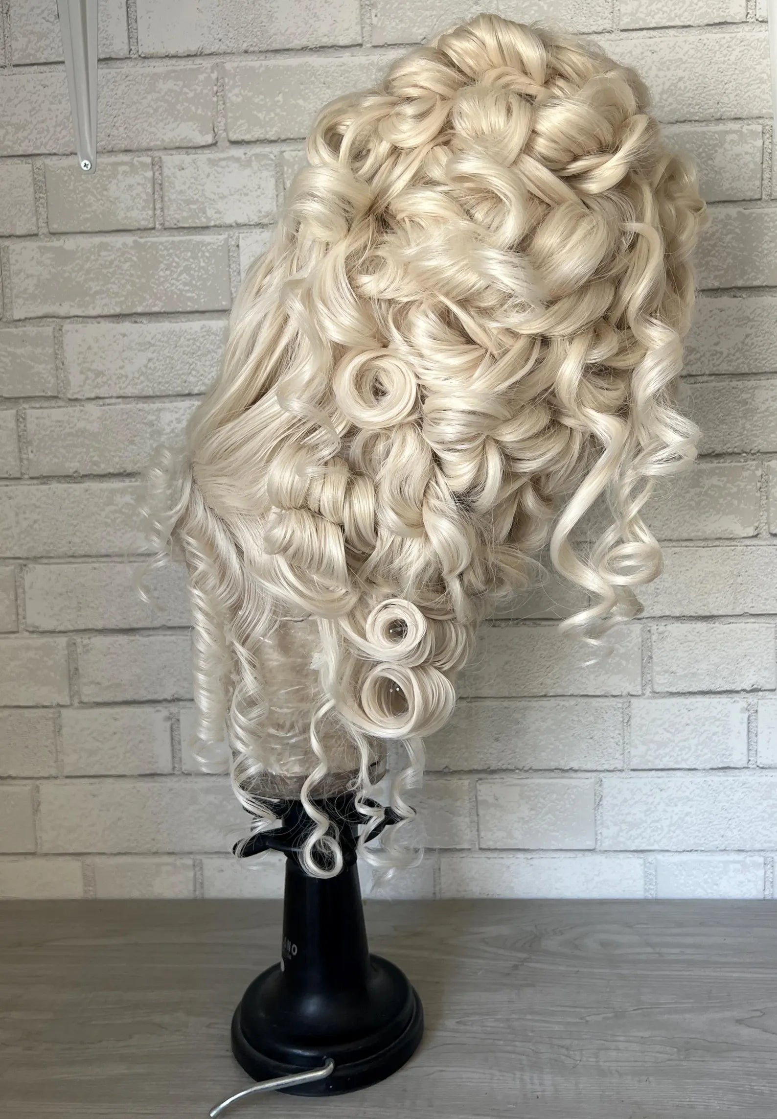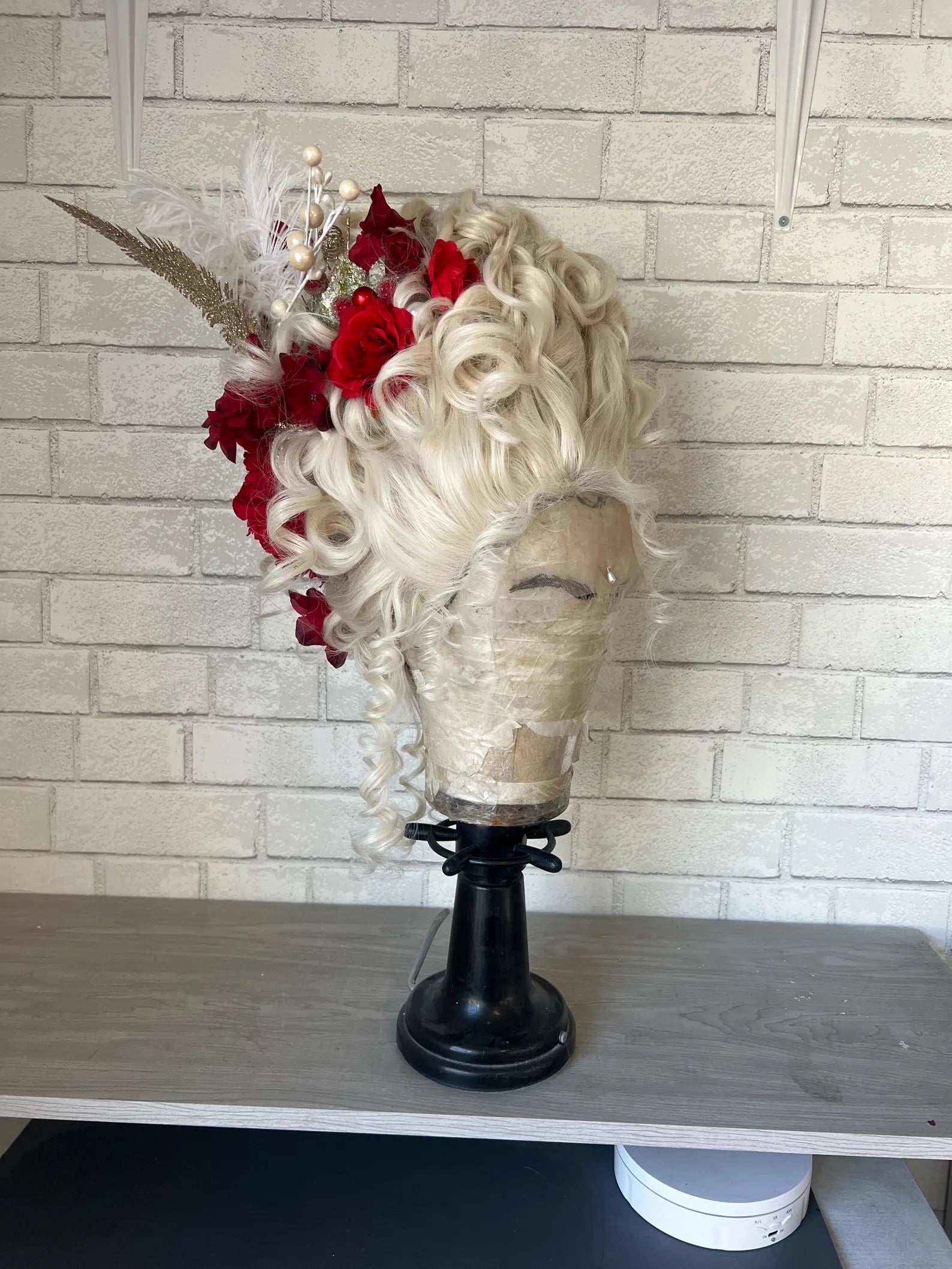 This extravagant wig is 24” tall for sky-high drama. accessories can be customized to suit your specific look. This exquisite wig features pilled tall white hair, adorned with decorative feathers and flowers for an authentic antique look. The lace hairline adds a touch of realism, while the voluminous style ensures a head-turning presence. This wig offers stability due to its wig cage for long lasting style.
