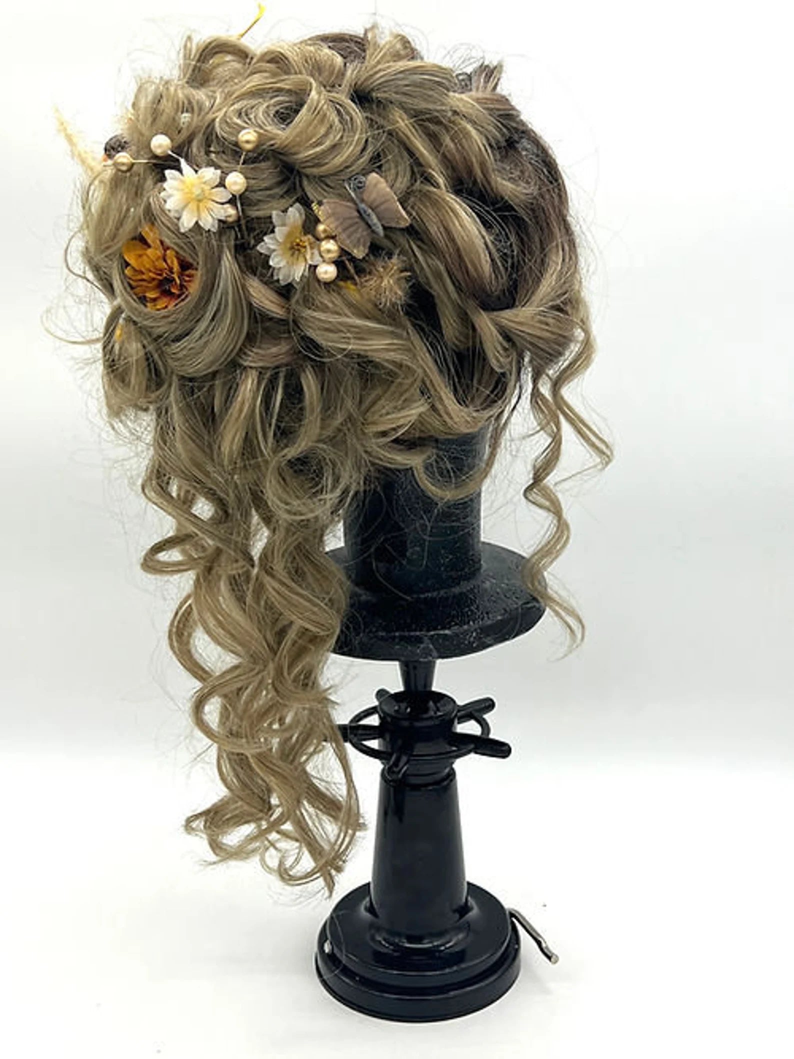 Step into the romantic elegance of the 18th century with our stunning blonde updo wig adorned with vibrant yellow flowers and cascading curls. Crafted with meticulous attention to detail, this wig exudes timeless charm and sophistication. Fitted on a 21" block for precise construction, this wig offers a comfortable fit and lacefront hairline.